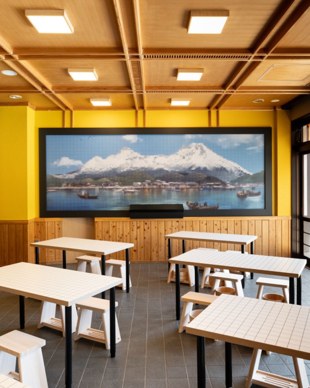 「湯けむり処 しかべ焼き」の店内は、どこか懐かしい“銭湯”をテーマにしたデザインが特徴です。