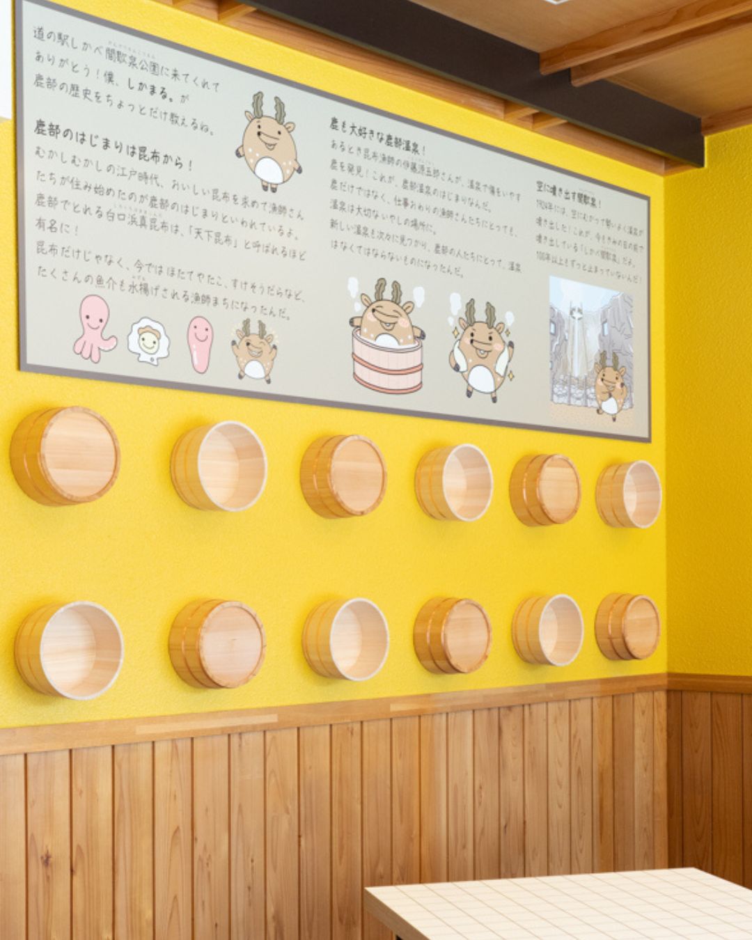 さらに、鹿部と間歇泉の歴史を紹介する壁面もあり、お食事とともに町の魅力に触れていただけます。
