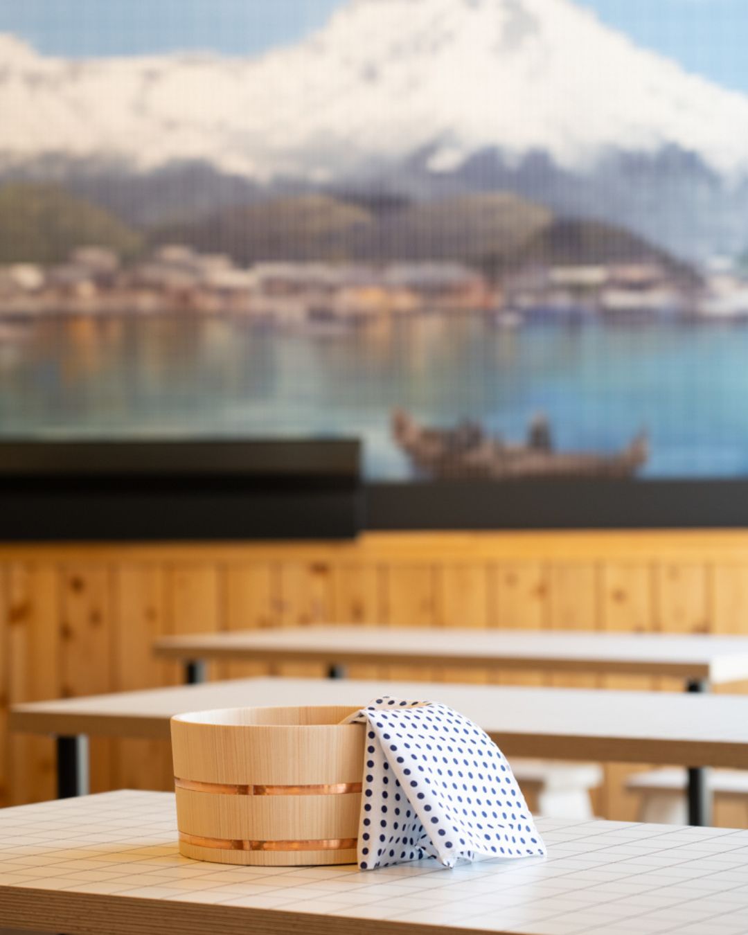 また、タイル調のテーブルや風呂イス、店内にさりげなく置かれた湯おけなど、銭湯らしさを演出する遊び心あるアイテムもポイント。