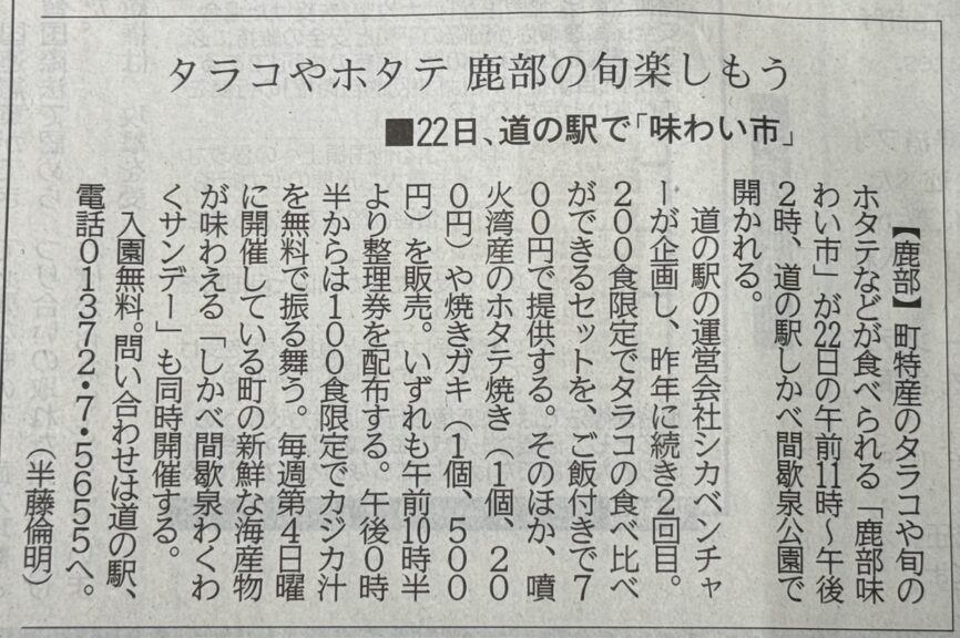 2026年2月19日(木)『北海道新聞』タラコやホタテ鹿部の旬楽しもう