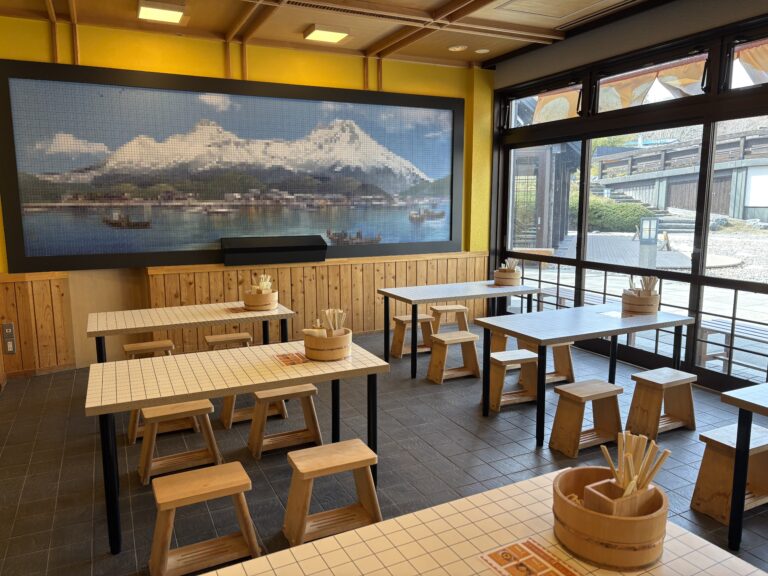 湯けむり処 しかべ焼きは、銭湯をモチーフにした内装で、桶やタイル模様のテーブルなど、かわいいポイントがたくさんあります!